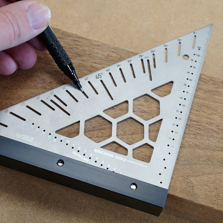Ultra Precise and built to perform, the Benchdogs Truangle Square - 130mm is the perfect tool for fast, reliable measuring and angle marking, whether in the workshop or on-site. Featuring a range of pre-defined angles for everyday use, it's perfect for quick, accurate marking on your material when paired with our Benchdogs Mechanical Pencil.